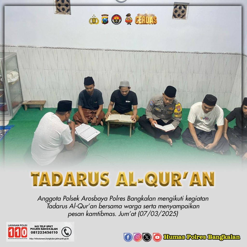 Dalam rangka memeriahkan bulan suci Ramadan, Setya anggota Polsek Arosbaya Jajaran Polres Bangkalan mengikuti kegiatan tadarus Al-Quran dan menyampaikan Kamtibmas, pada Jumat (7/3/2025).