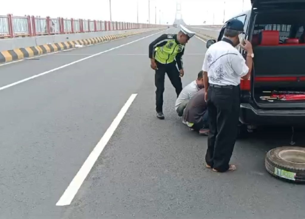 Anggota Satuan Lalu Lintas (Satlantas) Polres Bangkalan, Aipda Maulidi melakukan aksi kepedulian dengan membantu seorang warga yang mengalami pecah ban mobil di Jembatan Tol Suramadu sisi Madura.