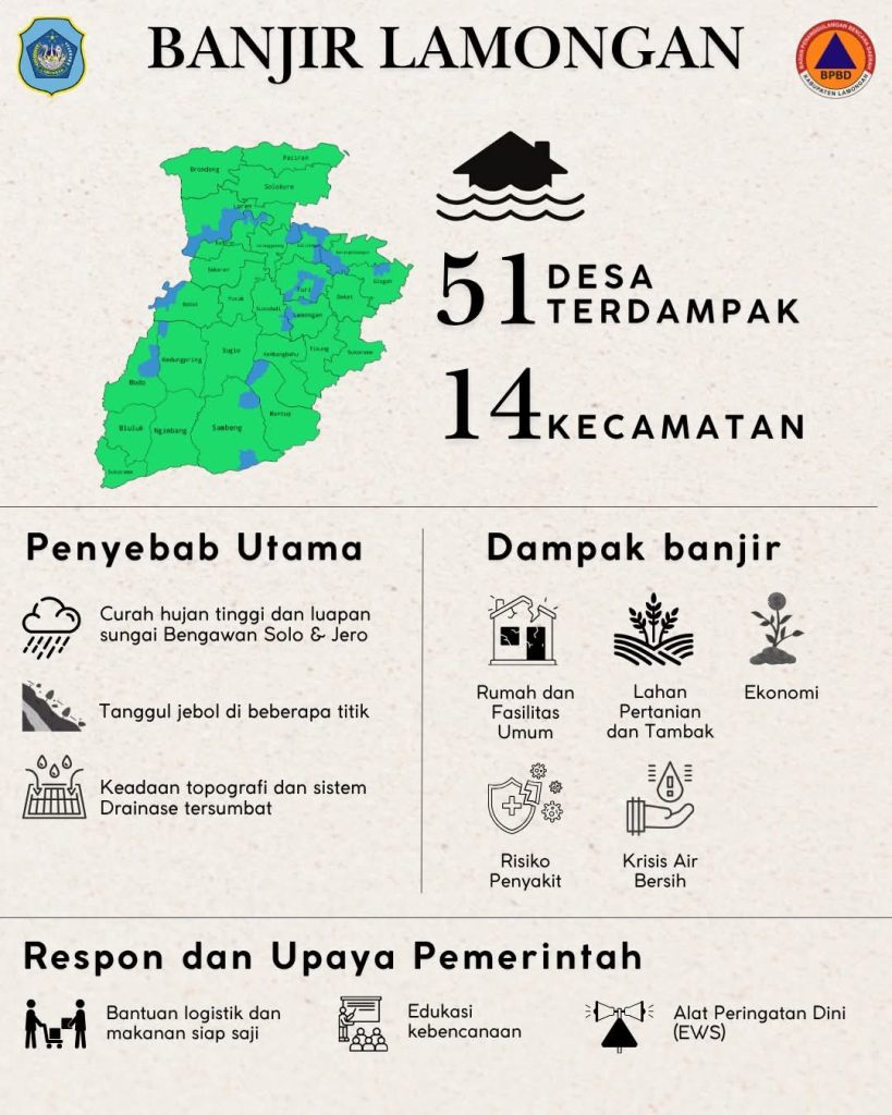 Lamongan, Pojok Kiri.com-Hingga Oktober 2025, bencana banjir telah melanda sedikitnya 51 desa di 14 kecamatan di Kabupaten Lamongan. Curah hujan tinggi disertai luapan Sungai Bengawan Solo dan Sungai Jero, serta sistem drainase yang tersumbat, menjadi penyebab utama terjadinya banjir di sejumlah wilayah tersebut.