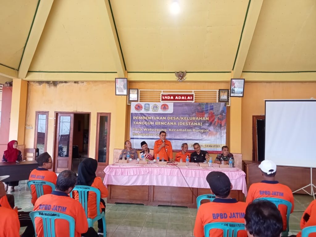 Kepala Pelaksana BPBD (Badan Penanggulangan Bencana Daerah) Provinsi Jawa Timur (Jatim) Gatot Soebroto, SE., M.PSDM menggelar kegiatan Pembentukan dan Pelatihan Desa Tangguh Bencana (Destana) di Desa Watuagung, Pulau Mengare, Kecamatan Bungah, Kabupaten Gresik, Kamis (8/5/2025).