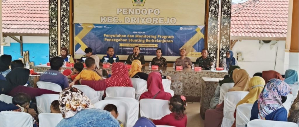 PT Jasa Marga Surabaya-Mojokerto (JSM) bersama Pemerintah Kecamatan Driyorejo melaksanakan kegiatan Penyuluhan dan Monitoring Program Pencegahan Stunting Berkelanjutan di Pendopo Kecamatan Driyorejo, Kabupaten Gresik, Jumat (13/12/2024). Acara ini dihadiri oleh sekitar 120 peserta, termasuk tokoh pemerintah dan masyarakat setempat.