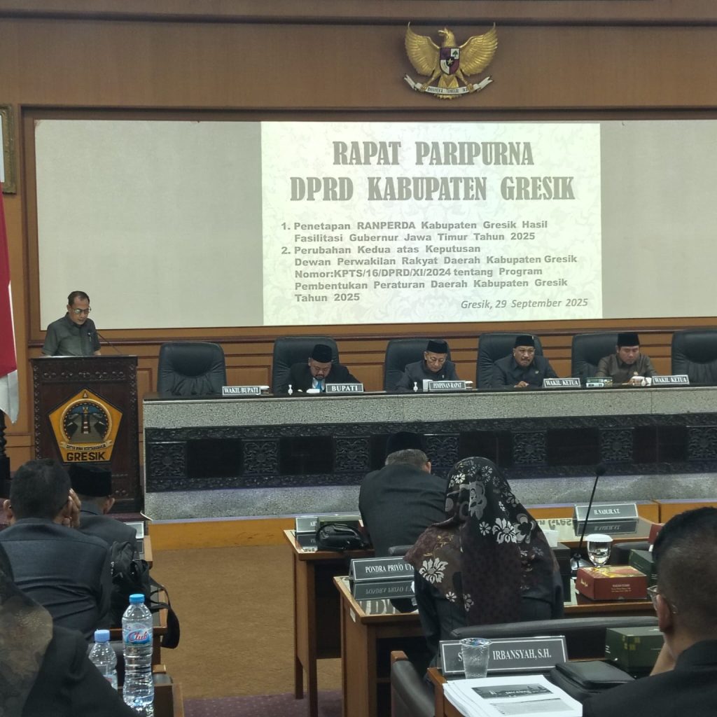 Rapat paripurna dengan agenda Penetapan Rancangan Peraturan Daerah (Ranperda), hasil fasilitasi Gubernur Jawa Timur. Serta perubahan kedua program pembentukan peraturan daerah (Propemperda) Tahun 2025, Bupati apresiasi kerja keras DPRD proses penuntasanya.