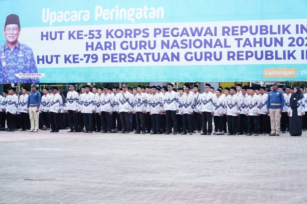LAMONGAN, POJOK KlRI.com-Pemerintah Kabupaten Lamongan gelar upacara peringatan Hari Guru Nasional (HGN) 2024, HUT Korps Pegawai Republik Indonesia (Korpri) ke 53, dan HUT Persatuan Guru Republik Indonesia (PGRI) ke 79, Jum’at (29/11) di Alun-alun Kabupaten Lamongan.
