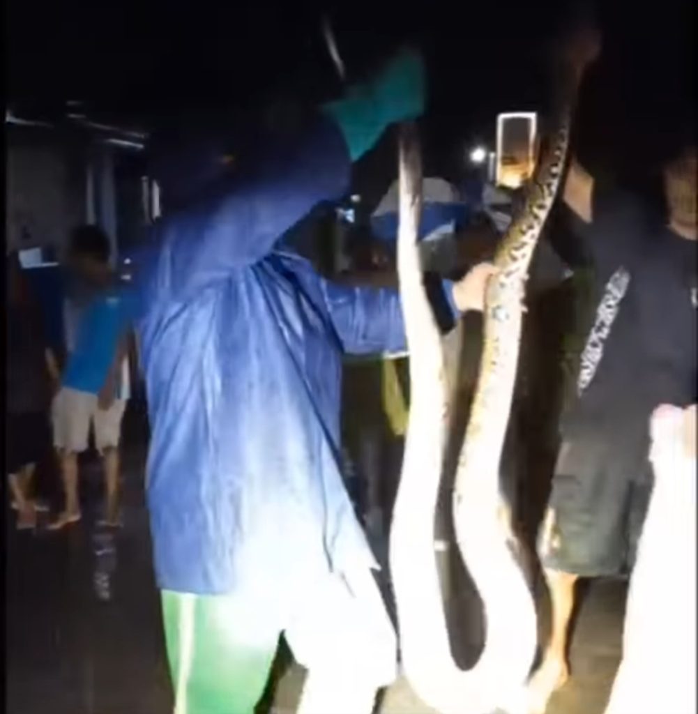 Lamongan, Pojok Kiri.com- Seekor ular piton sepanjang 2,5 meter berada di tengah Jalan Tambangan, Gang Kali Konang, Desa Banaran, Kecamatan Babat, saat hujan deras terjadi pada Minggu malam (18/5/2025) sekira pukul 19.00 WIB