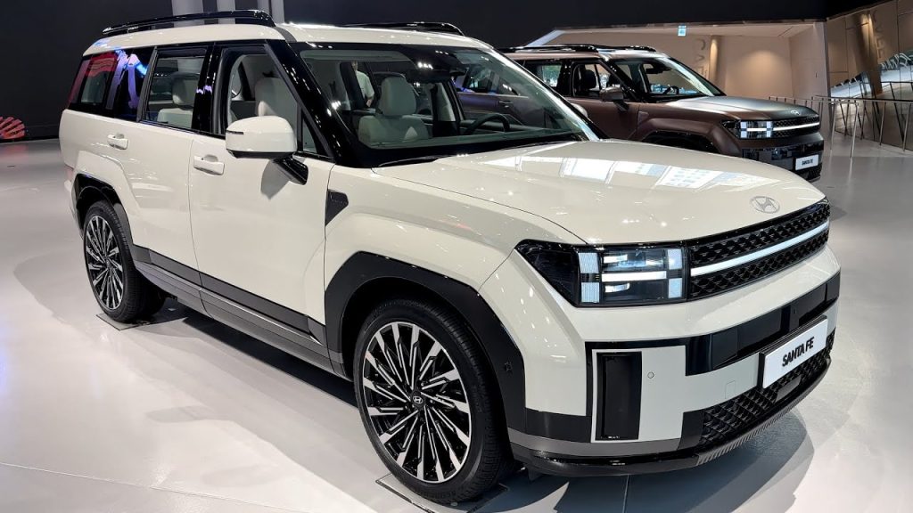 Desain eksteriornya sangat boxy dengan sentuhan modern di beberapa bagian. Bagian depan didominasi lampu utama berbentuk ‘H’ yang terintegrasi dan menyatu dengan grille. Posisi duduk di All New Hyundai Santa Fe sangat dominan ala SUV dengan visibilitas luas.
