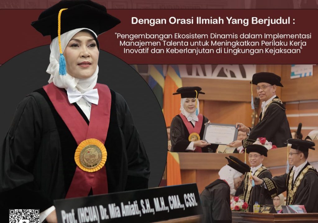 Dalam orasi ilmiahnya yang berjudul “Pengembangan Ekosistem Dinamis dalam Implementasi Manajemen Talenta untuk Meningkatkan Perilaku Kerja Inovatif dan Keberlanjutan di Lingkungan Kejaksaan,” Prof. (HCUA) Dr. Mia Amiati memaparkan secara mendalam mengenai tantangan dan peluang dalam pengembangan sumber daya manusia (SDM) di lingkungan Kejaksaan.