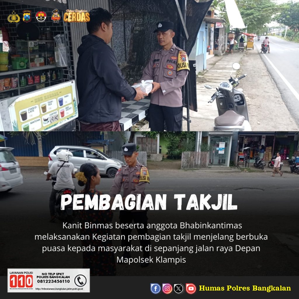 Menjelang berbuka puasa, Kanit Binmas beserta anggota Bhabinkamtibmas Polsek Klampis, melaksanakan kegiatan pembagian takjil kepada masyarakat di sepanjang jalan raya Depan Mapolsek Klampis.