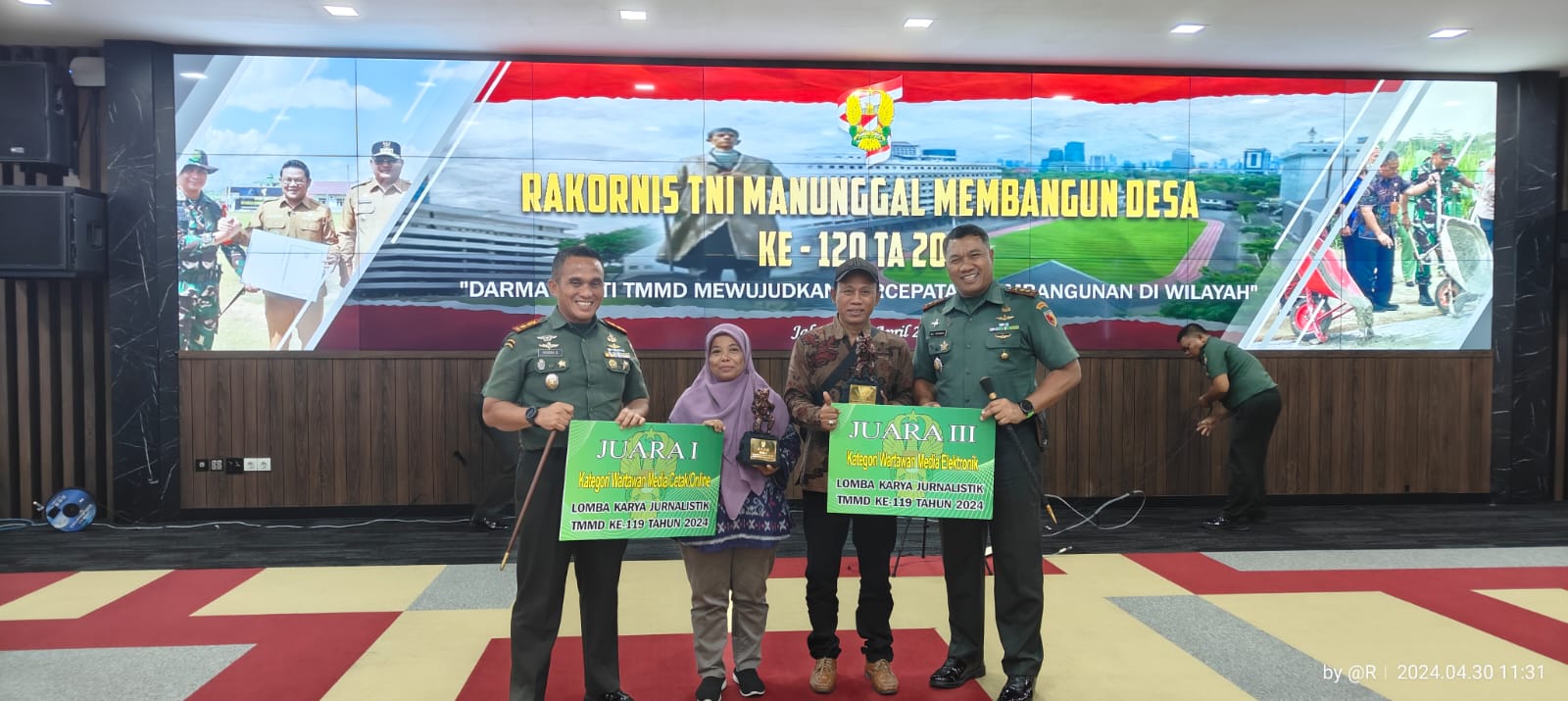 Penyerahan penghargaan pemenang Lomba Karya Jurnalistik (LKJ) diberikan langsung oleh Wakil Asisten Teritorial (Waaster) Kasad Bidang Perencanaan dan Kemamppuan Teritorial Brigjen TNI Terry Tresna Purnama bertepatan dalam kegiatan Rakornis TMMD ke 120 yang digelar di Aula A.H Nasution Mabekas Besar Angkatan Darat (Mabesad), Selasa (30/4/2024).