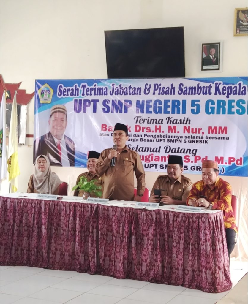 Kepala Dinas Pendidikan Gresik, S. Hariyanto, memberikan apresiasi tinggi atas dedikasi M. Nur dan menyambut hangat kehadiran Sugianto.