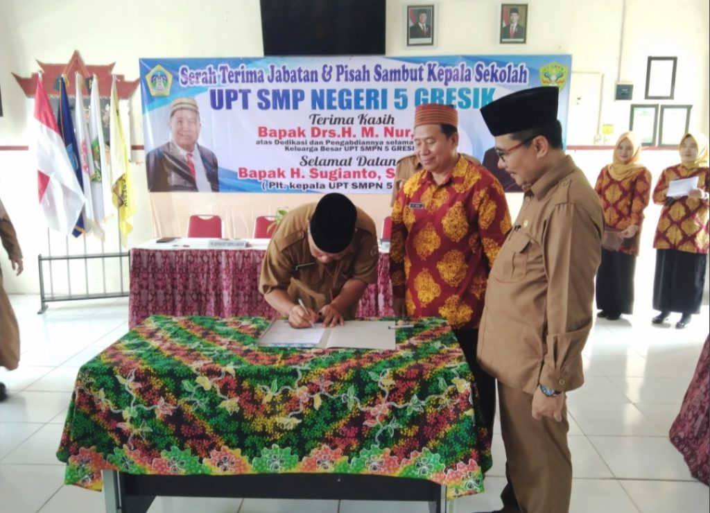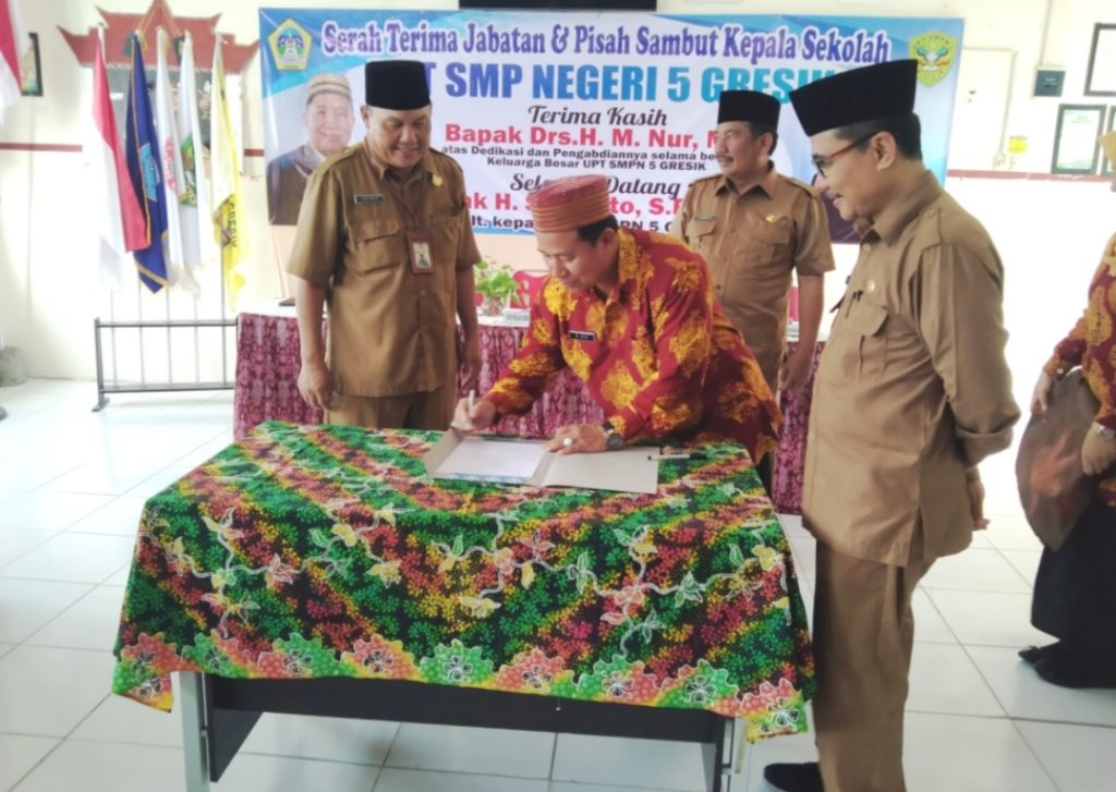 Dalam acara ini dihadiri langsung oleh Kepala Dinas Pendidikan Kabupaten Gresik, Dr. S. Hariyanto, S.Pd., M.M yang menyaksikan prosesi peralihan tongkat estafet kepemimpinan di salah satu sekolah unggulan Gresik tersebut. Tampak hadir Bidang Pengelolaan Pendidikan Sekolah Menengah Pertama Dr Ahmad Syifaul Qulub, S.Ag., M.Ei, Ketua MKKS UPT SMP Negeri Gresik H. Beri Avita Prasetya, M.Pd, MM dan seluruh Kepala Sekolah SMPN sewilayah Gresik Barat, Kades, Komite dan semua guru, Senin (2/3/2026) pagi di aula SMPN setempat.