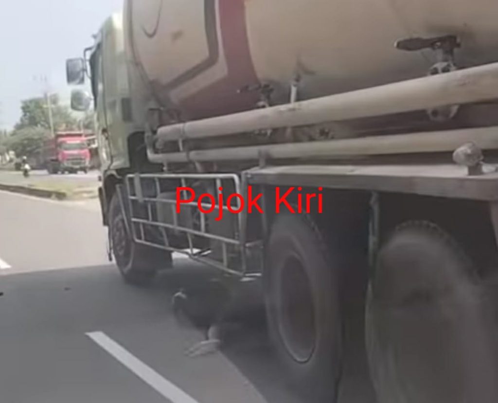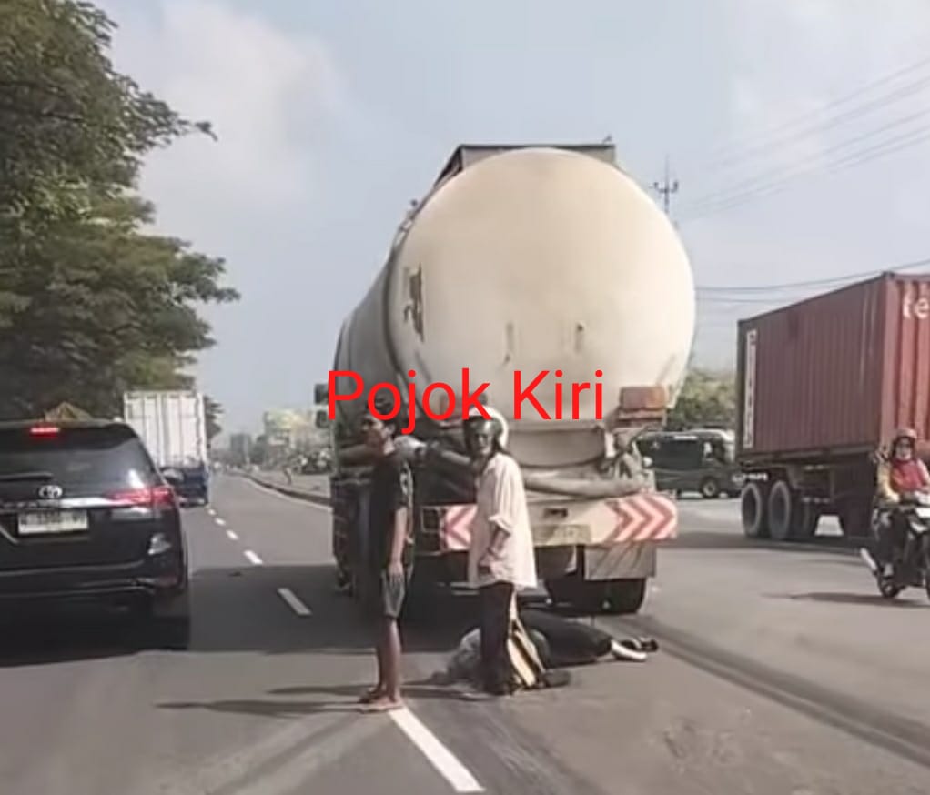Sebuah sepeda motor yang ditumpangi pasangan suami istri terlibat tabrakan dengan truk tronton tangki semen curah, hingga mengakibatkan satu orang tewas di tempat dan satu lainnya luka berat.