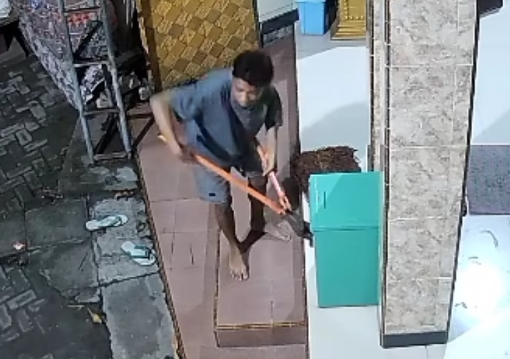 Dari rekaman CCTV yang terpasang di musholla, terlihat seorang pria muda diperkirakan berusia sekitar 19 tahun melakukan aksinya. Pelaku mengenakan kaos biru dongker dan celana pendek berwarna senada.