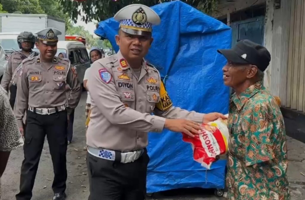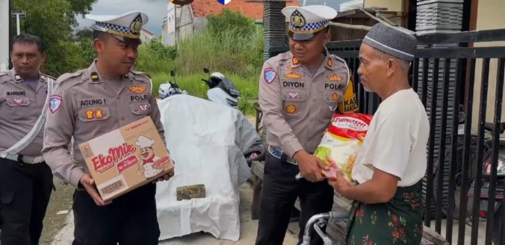 Dipimpin Kasat Lantas Polres Bangkalan, AKP Diyon Fitrianto, S.H., M.H. petugas menyerahkan bantuan sembako bagi masyarakat Dhuafa dan korban kecelakaan lalu lintas.