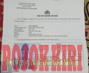 Banyuwangi || pojokkiri.com – Rehati Seorang janda (64) warga Dusun kelir, RT 01 RW 01, Desa bunder, Kecamatan kabat, Kab. Banyuwangi, dilaporkan hilang sejak hari rabu 26 oktober 2022. Sekira jam 04:00 Wib.