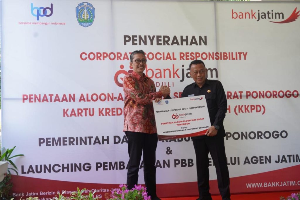 Ponorogo, Pojok Kiri-. PT Bank Pembangunan Daerah Jawa Timur Tbk (bankjatim) secara resmi telah menyerahkan bantuan Corporate Social Responsibility (CSR) kepada Pemerintah Kabupaten (Pemkab) Ponorogo pada hari Selasa (28/5). Bantuan yang diberikan yaitu penataan alun-alun sisi barat berupa pedestrian trotoar di Kabupaten Ponorogo. Bertempat di Rumah Dinas Bupati Ponorogo, penyerahan CSR dilakukan secara simbolis oleh Direktur Utama bankjatim Busrul Iman kepada Bupati Ponorogo Sugiri Sancoko.
