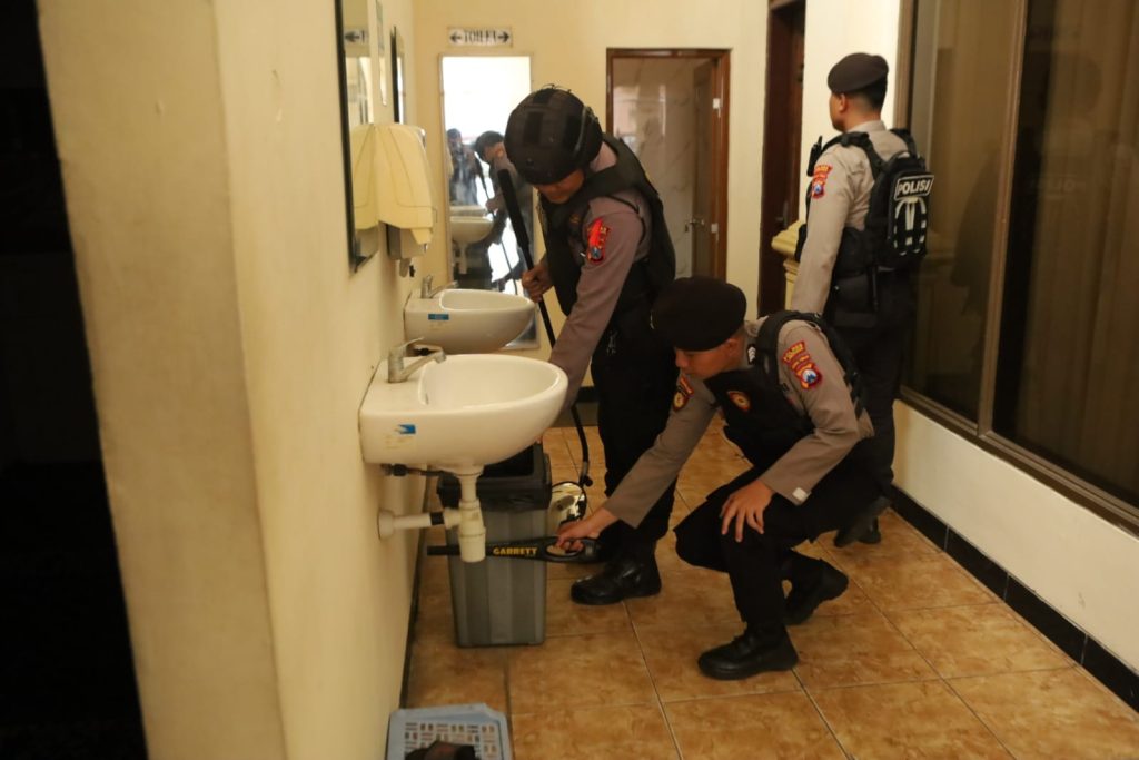 Tim sterilisasi menggunakan alat deteksi keamanan dan pemeriksaan manual untuk memastikan tidak ada barang mencurigakan atau potensi ancaman lain di area tersebut.